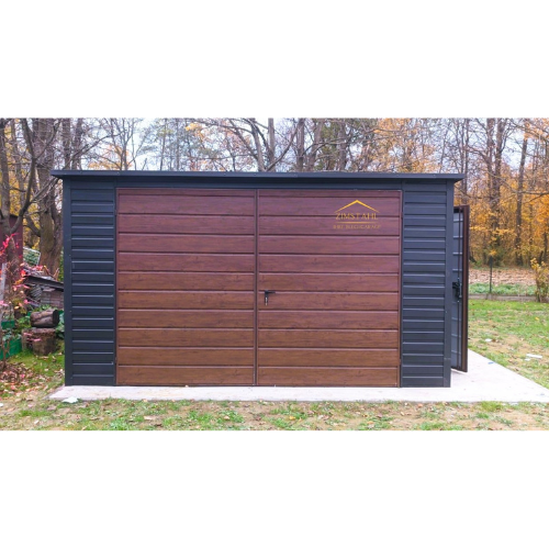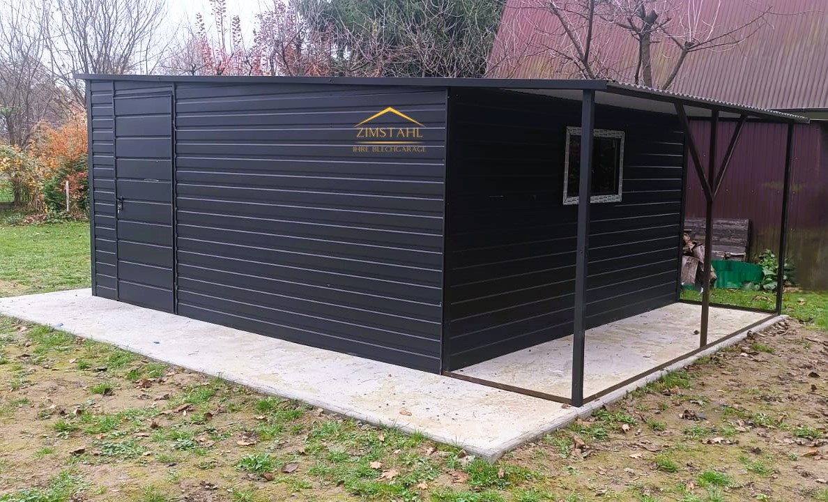 Blechgarage 3,50m x 5m in der Farbe Anthrazit (BTX 7016) und Holzoptik Doppelflügeltor mit Überdachung 3,50m x 1m,  Pultdach mit Neigung nach hinten