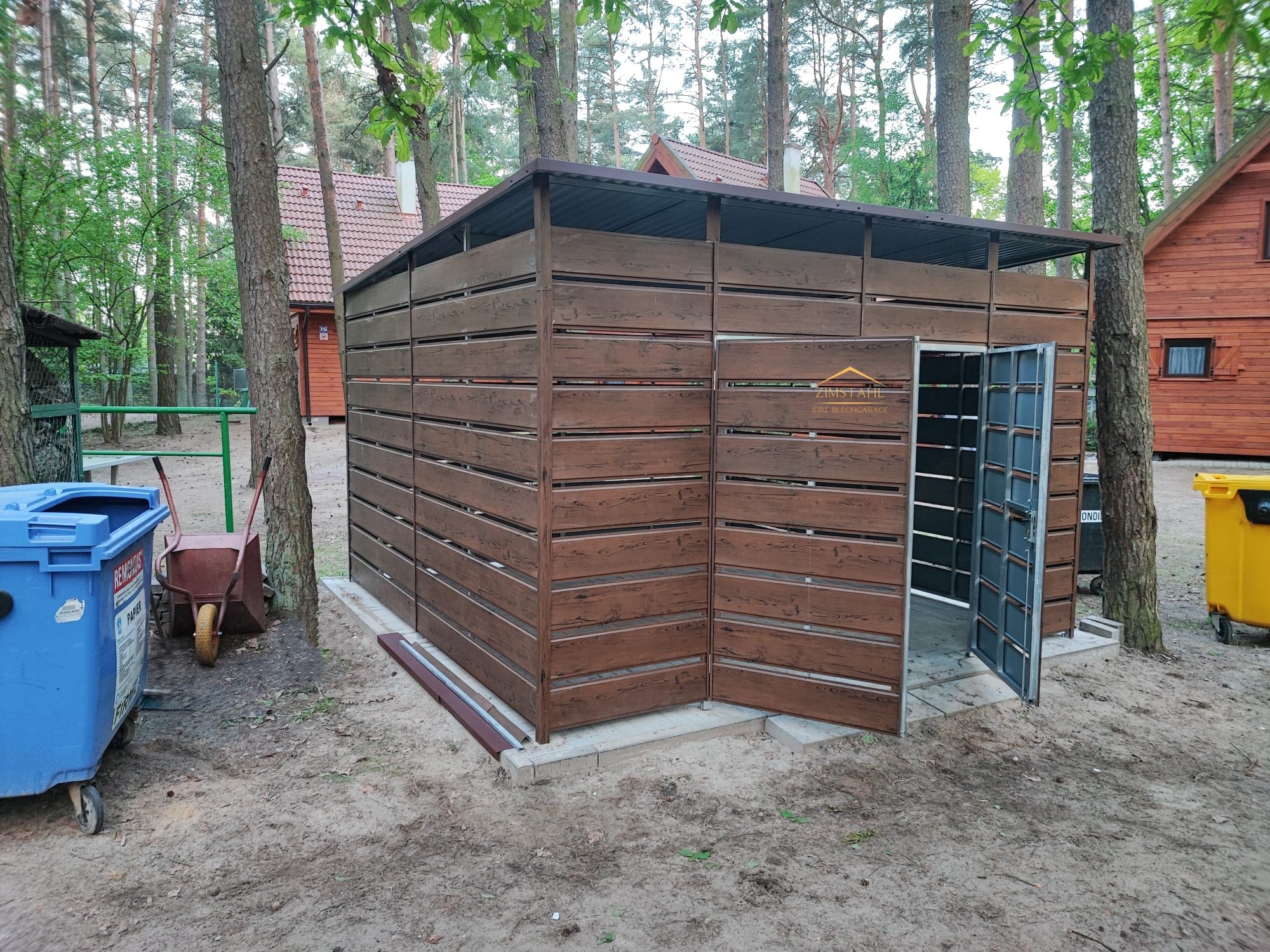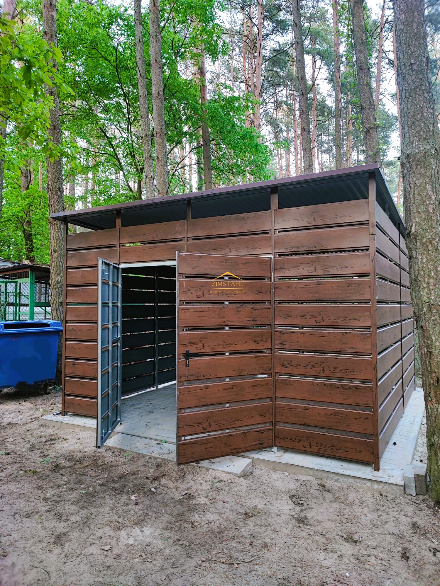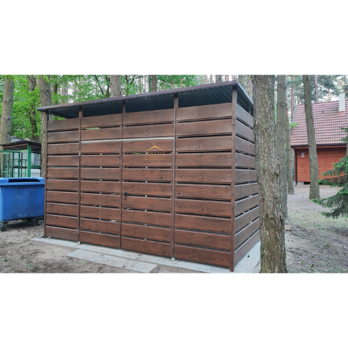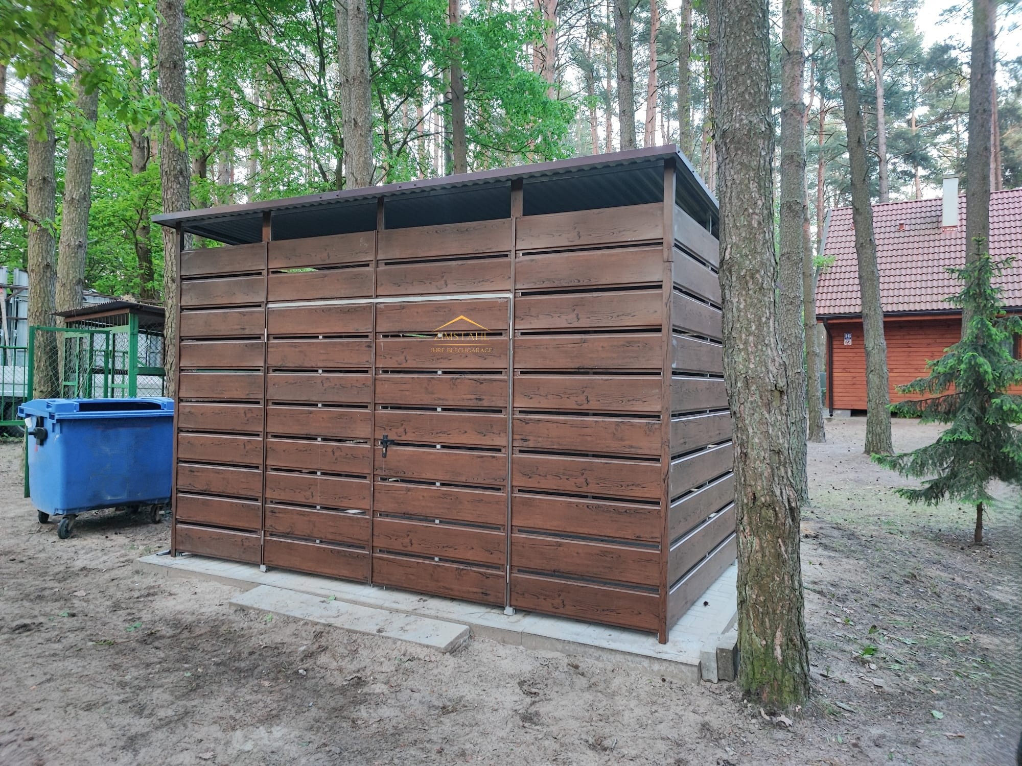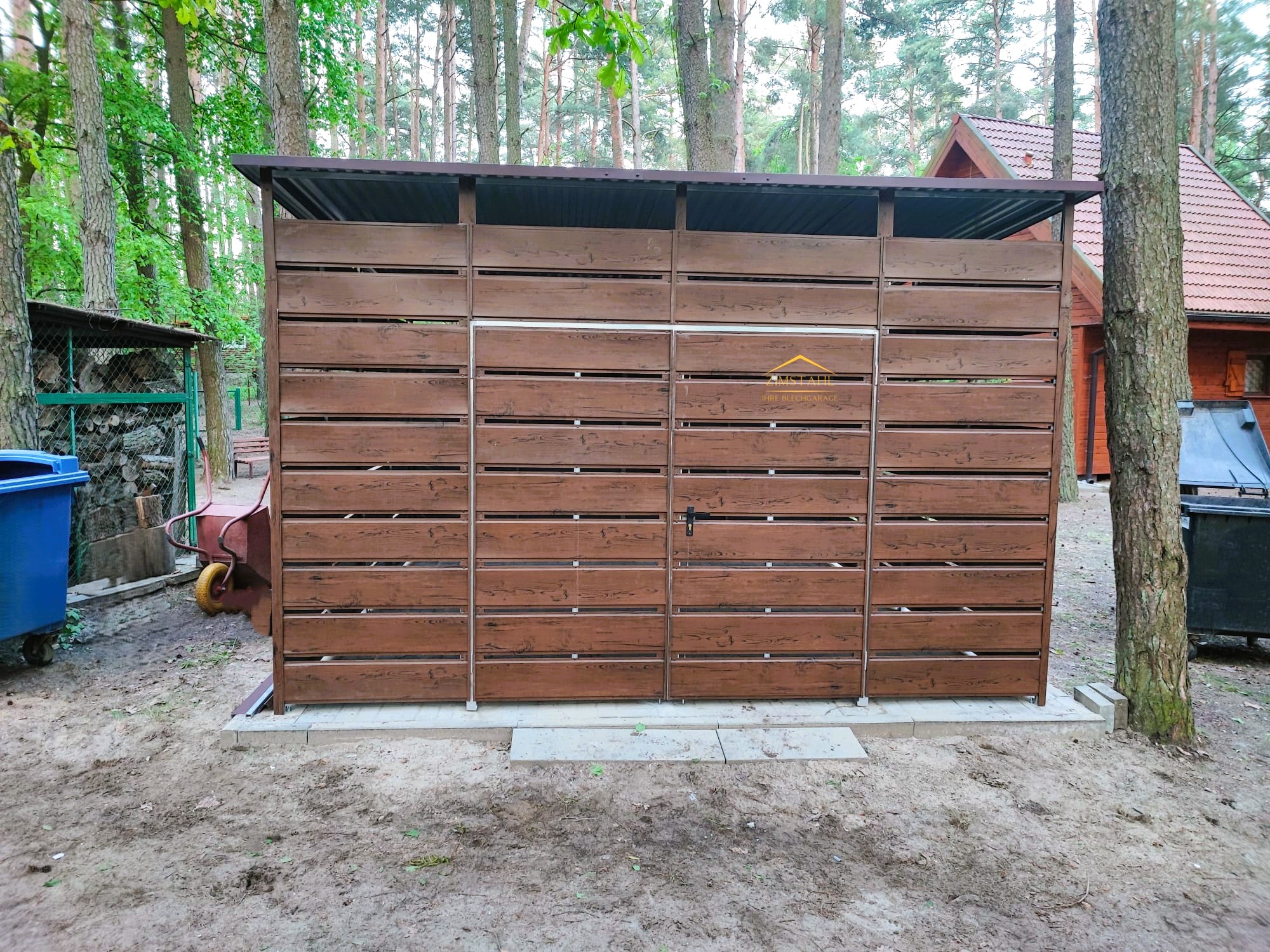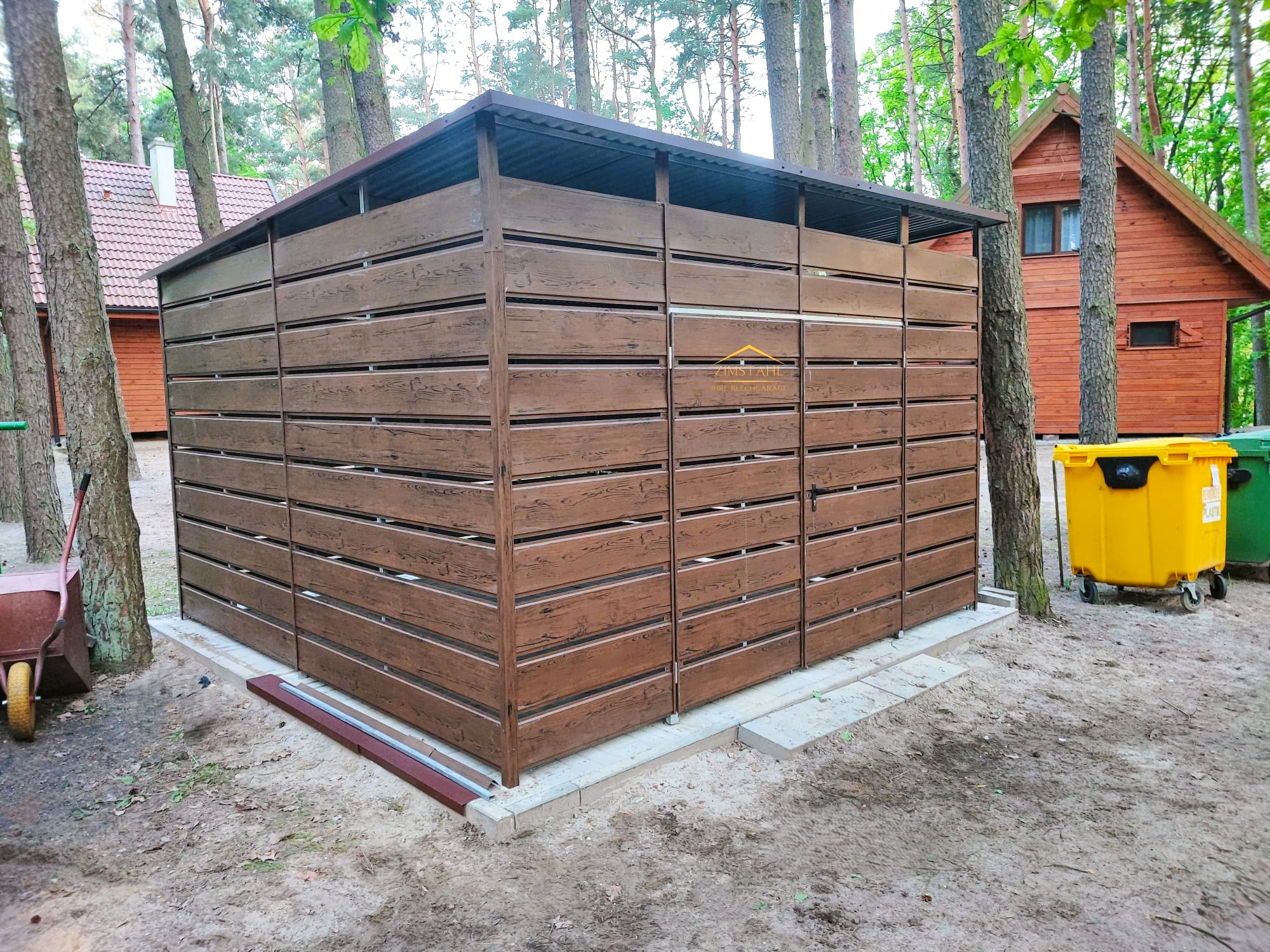 Mülltonnengehäuse, Müllhaus 4m x 4m mit Lüftungsschlitzen in der Farbe Holzoptik dunkle Walnuss, Pultdach mit Neigung nach hinten, Doppelflügeltor